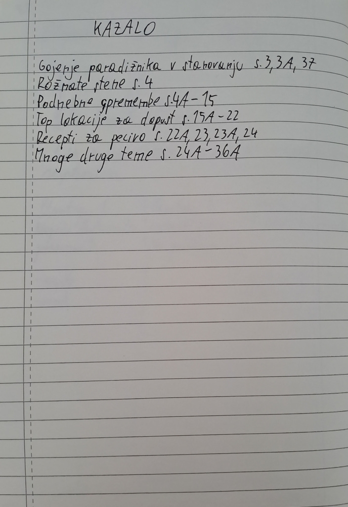 Če želimo biti super napredni pa lahko kazalo slikamo in ga shranimo v program, ki prepozna našo pisavo, kot na primer Evernote. Sicer sama tega ne delava, vendar možnost obstaja. Tam lahko v iskalnik napišemo “paradižnik” in program nam bo našel sliko kazala in potem vemo, kje iščemo naše zapiske.