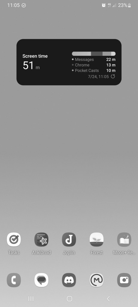 Sam sem opazil, da v zadnjih tednih največ uporabljam Chrome, aplikacije za branje knjig pa skoraj ne uporabljam. Ker se mi zdi branje knjig boljša poraba časa, bom zato v nastavitvah omejil, koliko časa na dan lahko uporabljam Chrome. Hkrati imam aplikacijo za branje na domačem zaslonu in v njej bom pripravil nekaj knjig, ki jih želim prebrati. Prejšnji teden sem Chrome uporabljal 3h 42min. Bralnik knjig pa 0 min. Upam, da bi s temi spremembami manj uporabljal Chrome in več časa bral stvari, ki se mi zdijo koristne. Screen time widget mi bo hitro povedal, ali mi uspeva.
