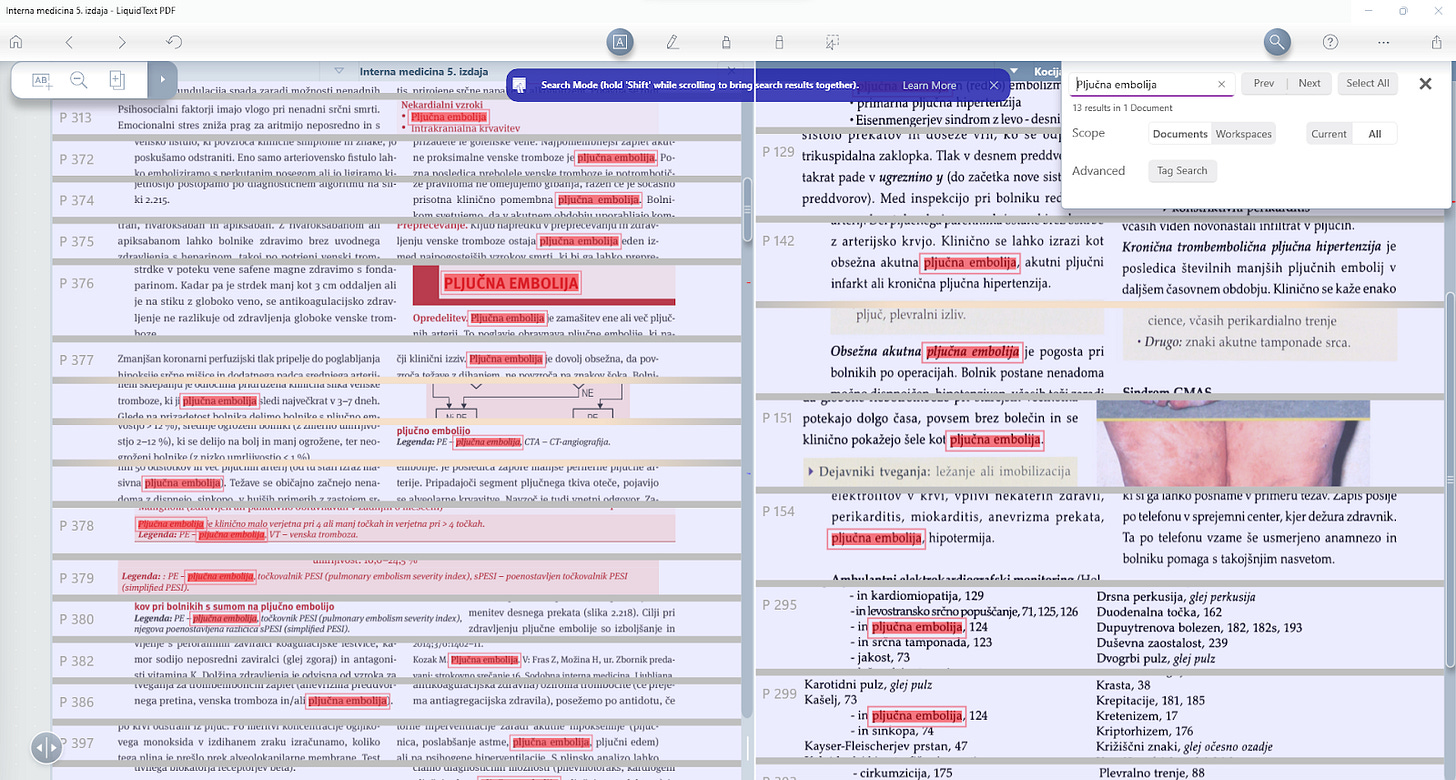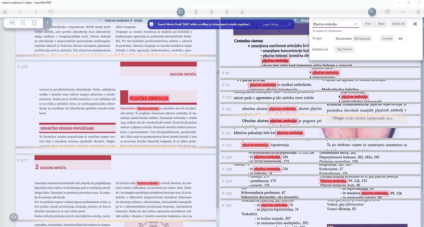 Z iskanjem lahko sočasno po obeh učbenikih iščem, kar me zanima. V tem primeru je to izraz “pljučna embolija”. Program najde vse omembe te bolezni v obeh knjigah. Potem pa lahko vse najdene izraze stisnem na kup, tako kot lahko vidite na drugi sliki.
